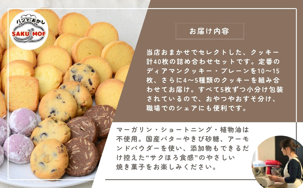 サクほろ食感、ぎゅっと40枚。 個包装で持ち歩きにもぴったりです。 おまかせクッキー40枚セット | クッキー おまかせ 詰め合わせ 焼き菓子 40枚 国産バター サクほろ 小分け ギフト おやつ お取り寄せ ほろほろ クッキーセット ディアマンクッキー サクモフ SAKUMOF 父の日 母の日 誕生日 パンとお菓子SAKUMOF 埼玉県 草加市