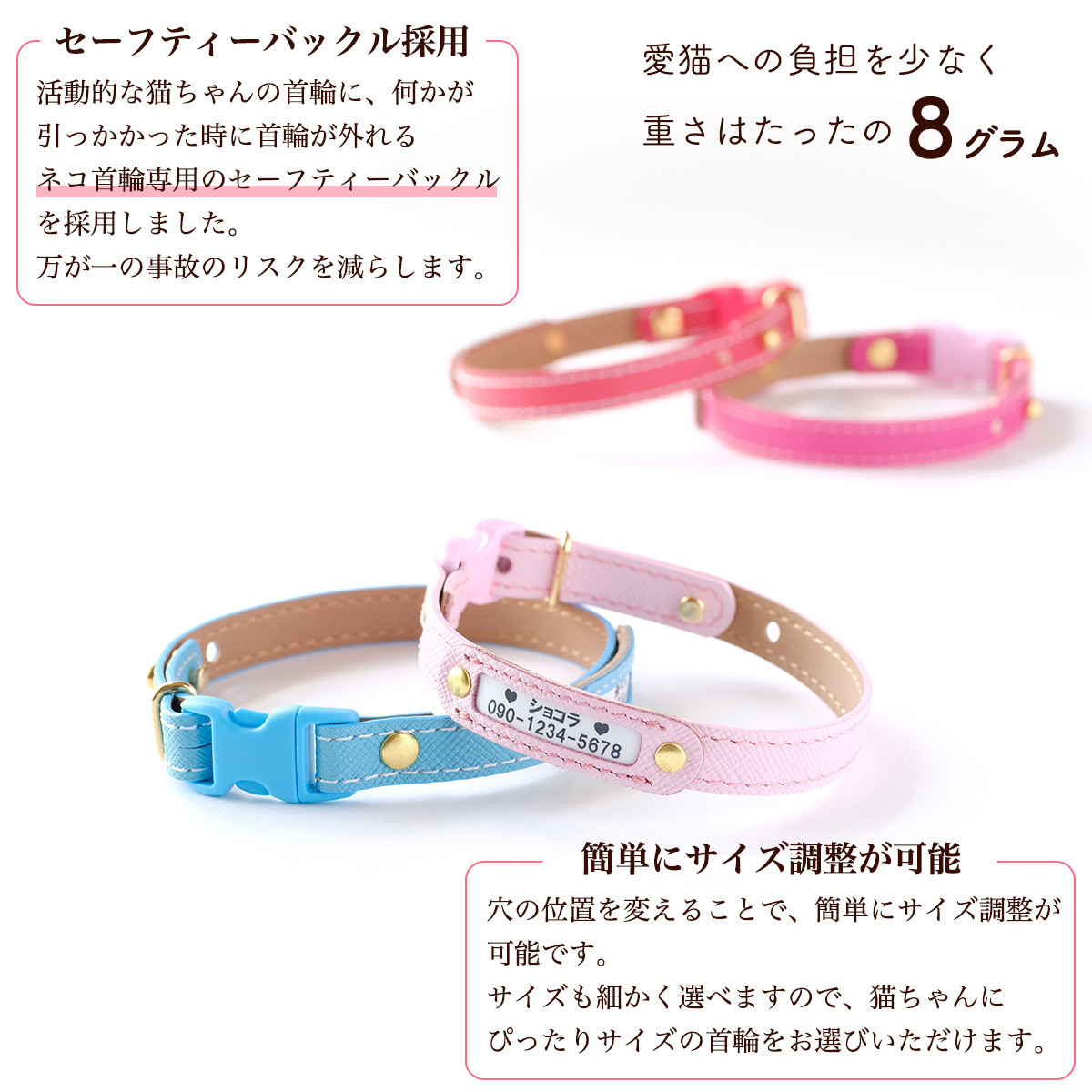 迷子札付き猫首輪 本革製 ネームタグ 猫用品 猫グッズ / 猫用 首輪 迷子札 ペットグッズ ペット用品 セーフティバックル使用 超軽量 愛猫 名入れ オーダー品 おしゃれ 可愛い プレゼント 贈り物 てるべる 埼玉県 No.018
