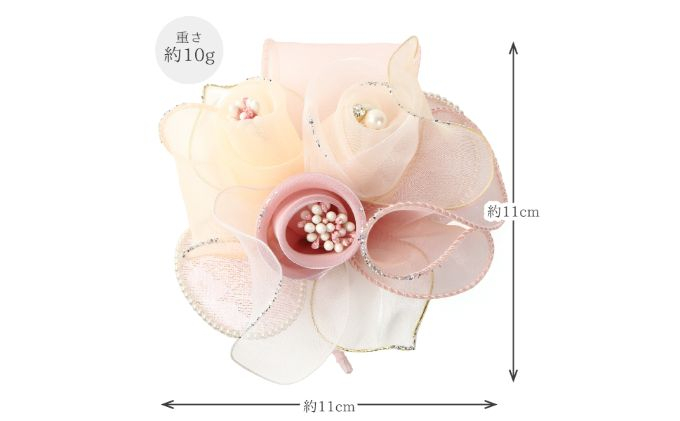 バラ3輪をメインとし、周りに色々装飾を施したボリュームのあるコサージュです。
