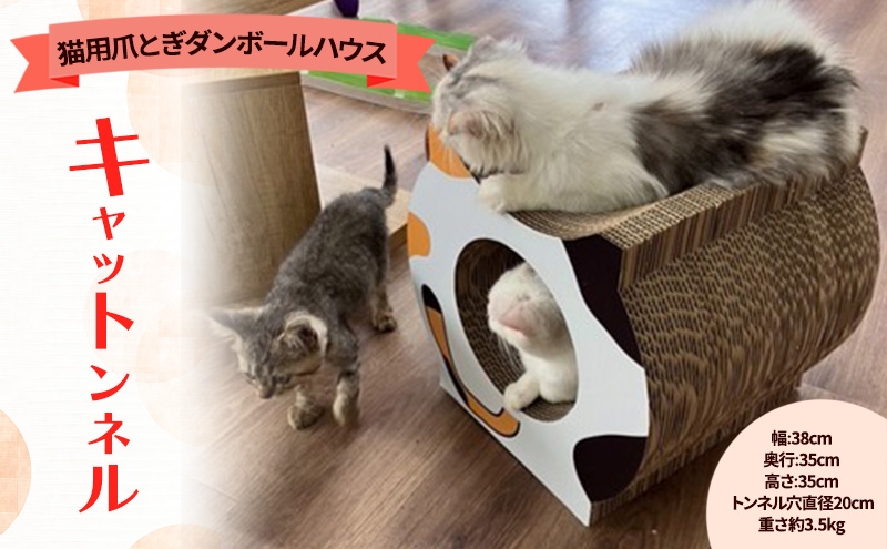| 容量 | キャットンネル 猫用爪とぎダンボールハウス 幅:38cm 奥行:35cm 高さ:35cm トンネル穴直径20cm 重さ約3.5kg 強化ダンボール 前後シール貼付け シール5種類(三毛 茶トラ 白 黒 サバ白) |