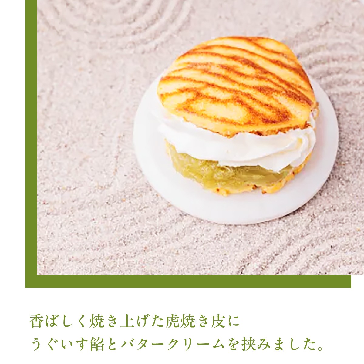 虎柄の皮にバタークリームとうぐいす餡を挟んだ洋風などら焼きです。