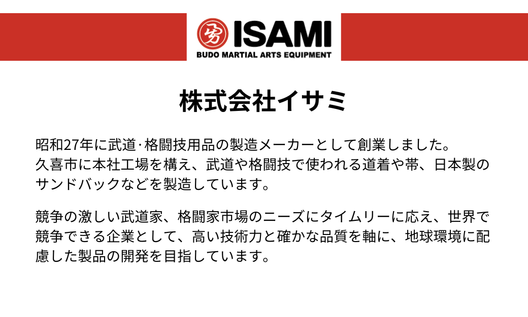 武道家、格闘家に役立つ製品を提供し、新しい製品価値を作り出す事が、我々イサミの理念です。これからは、競争の激しい武道家、格闘家市場のニーズをタイムリーに捉え、世界で競争できる企業と高い技術力、確かな品質を軸に、地球環境に配慮した製品の開発を目指しています。