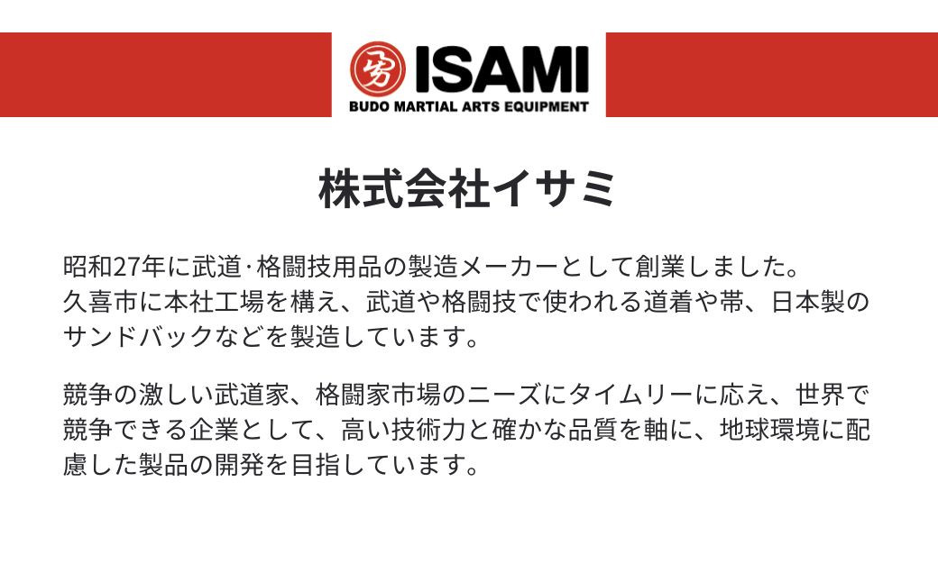 武道家や格闘家に役立つ製品を提供し、新しい製品価値を創造することが、我々イサミの理念です。これからは、競争の激しい武道家や格闘家市場のニーズにタイムリーに応え、世界で競争できる企業として、高い技術力と確かな品質を軸に、地球環境に配慮した製品の開発を目指しています。