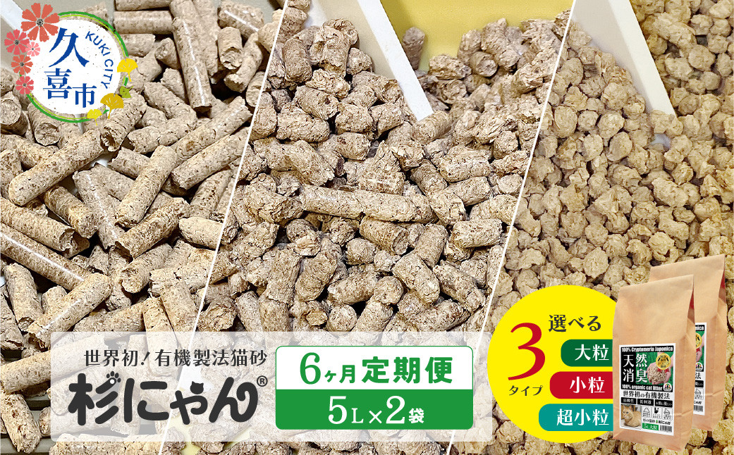 猫の肌にぴったりな杉を使用した猫砂。ストレスのかからない快適な環境を届けます 【6カ月定期便】オーガニック猫砂 杉にゃん 5L×2袋 選べるサイズ/超小粒 小粒 大粒 | 猫のトイレ 安心 食べて 臭い 匂い 木製ペレット ひのき スギ 消臭 品質 尿 おしっこ トイレ 自然 多頭 子猫 シニア 誤飲 高齢 木 香り アレルギー 咳 くしゃみ クシャミ にゃんこ 粉 国産 埼玉県 久喜市
