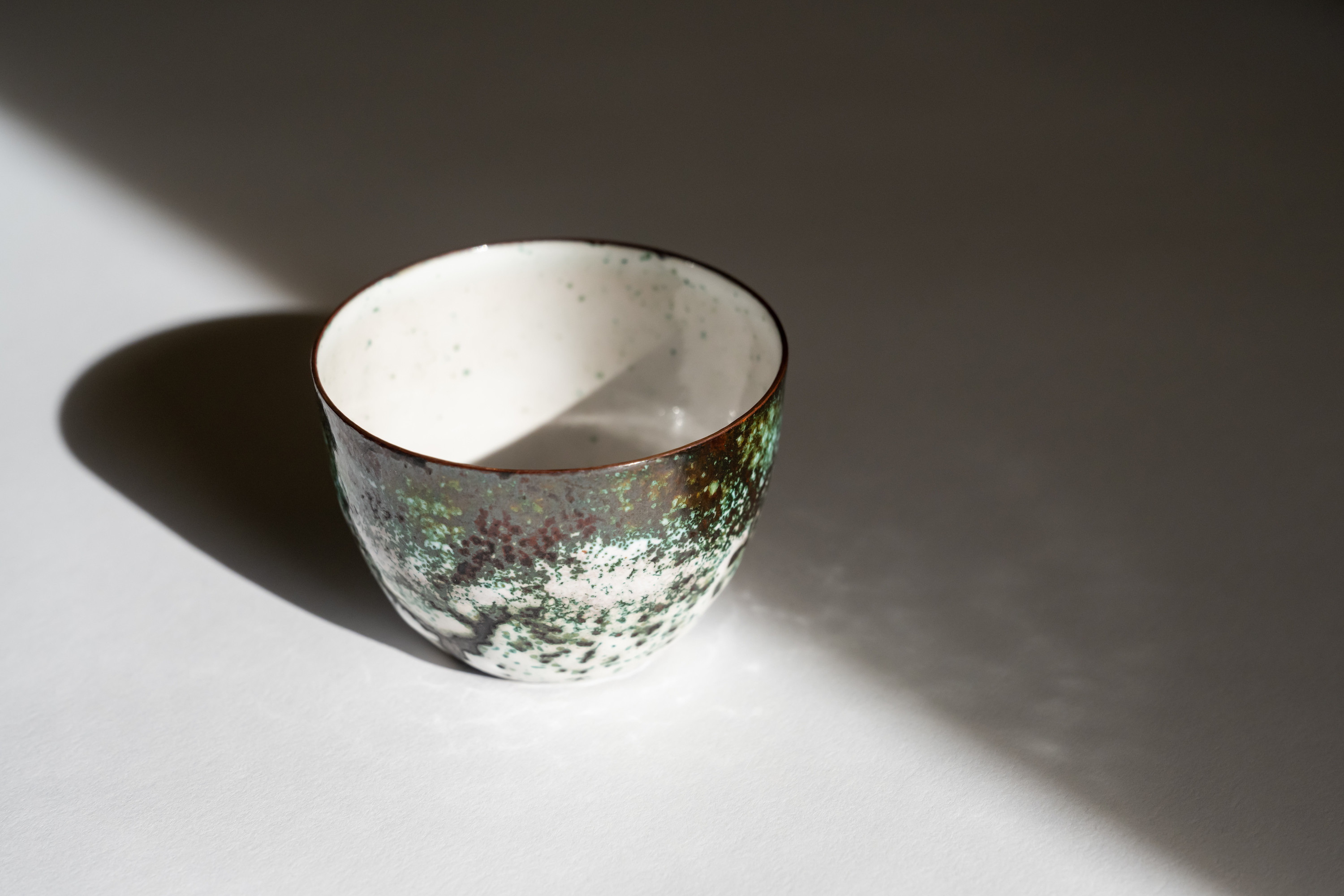 内側は白一色、外側は白と水色の釉薬のみを使用。熱で溶けた銅と溶けた釉薬が絡み合い、緑や黄色などにも変色しています。釉薬のかかった部分と、銅がダイレクトに出ている部分の立体的な手触りが楽しめます。型は、丸型と三角型の2種類。