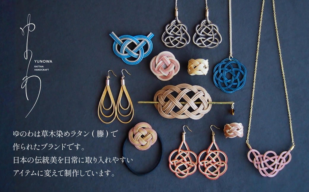 「ゆのわ」は、草木染めラタン(籐)で作られたアクセサリーブランドです。