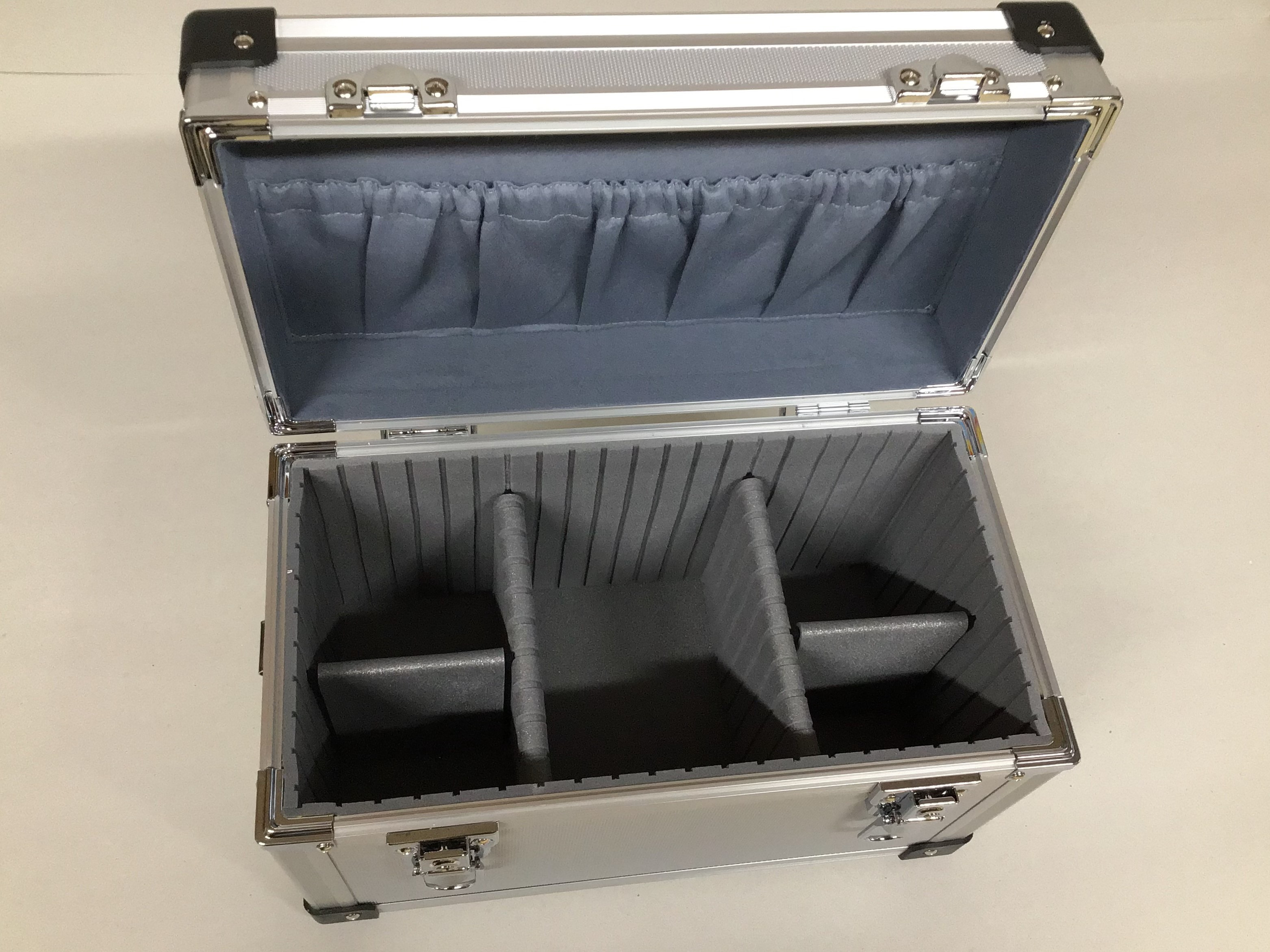 一眼レフカメラ/各種レンズなど一式を収納できます。その他、工具類などの収納にもご利用できる万能アルミケースです。