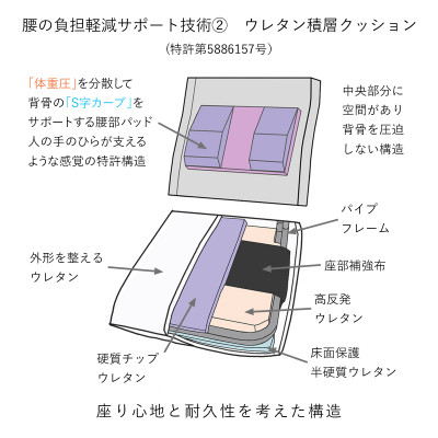 産学共同研究から生まれた腰部パッドが「体重圧」を分散、背骨の「S字カーブ」をサポート。(特許第5886157号)