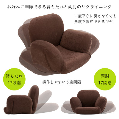 背もたれと両肘には、操作しやすい5度間隔の17段階(95度~175度)リクライニング機能付き。一度平らに戻さなくても角度を変えられるギヤを採用。