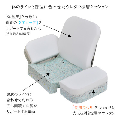 両肘はクッションの厚さとリクライニングで骨盤まわりをしっかり支える構造。