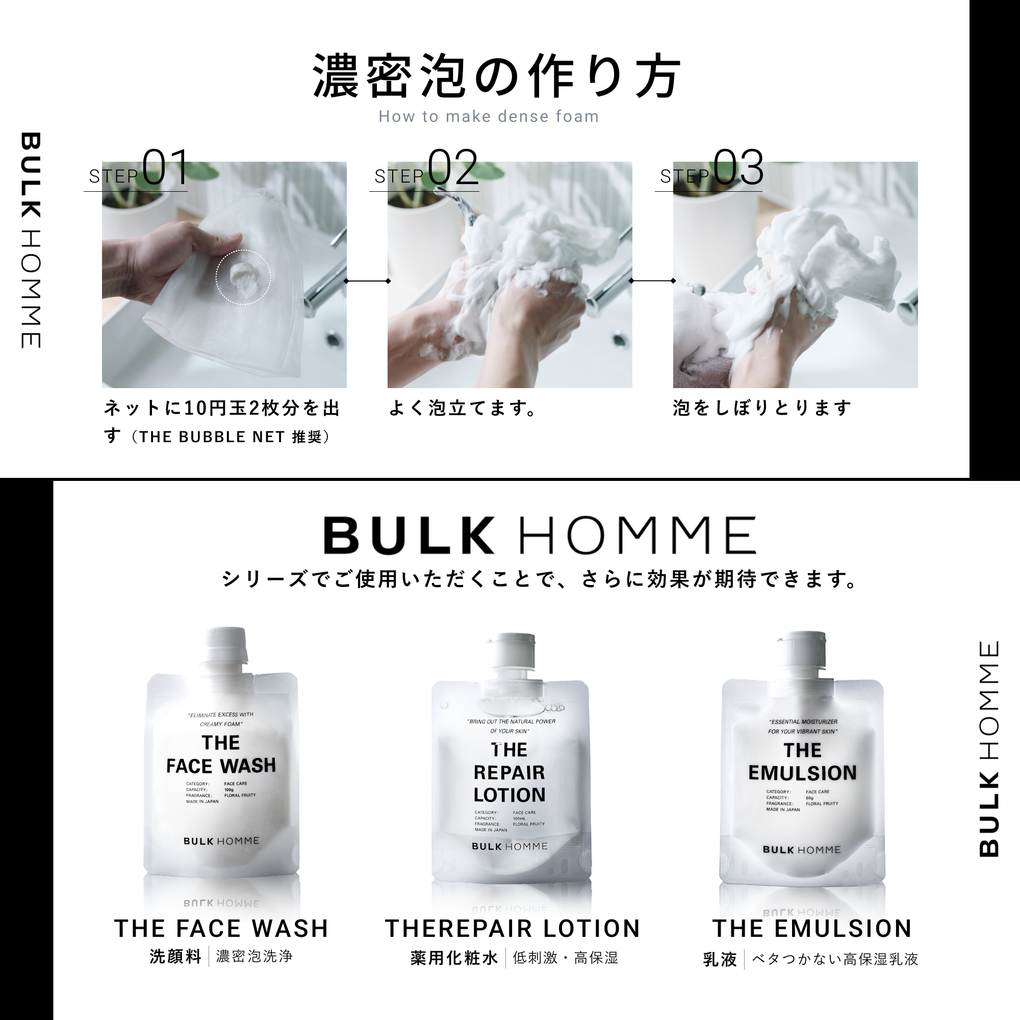 BULK HOMME創業以来、不動の⼈気No1プロダクトであるTHE FACE WASH。濃密で分厚い泡に包まれて顔を洗うという体験は、唯⼀無⼆の価値だと考えています。だからこそ、⽔分・油分のバランスが崩れがちな傾向がある男性の肌にとって必要な「不要な汚れや⽪脂はしっかり落しつつ、肌に必要な潤い成分は残す、摩擦レスな洗顔」という体験はそのままに、泡⽴ち、泡質、洗い流した後のつっぱりにくい後肌感をより⾼めるために、処⽅と成分を⾒直し、アップデートしました。