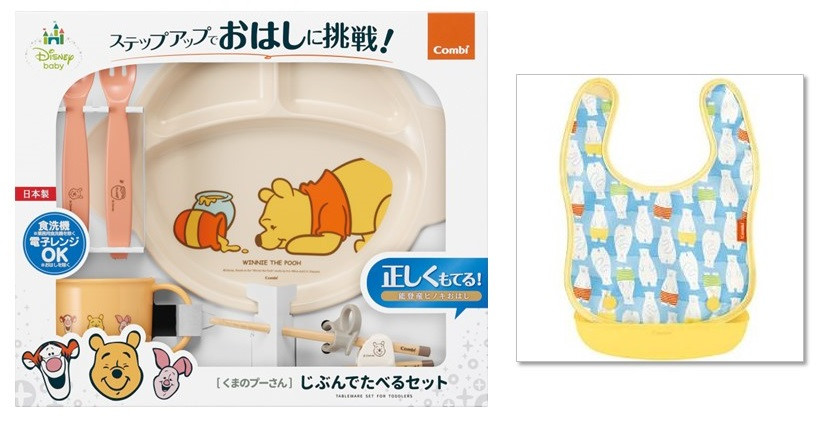016-003 【コンビ Combi】くまのプーさんじぶんで食べる食器と油が落ちるエプロン(しろくま)