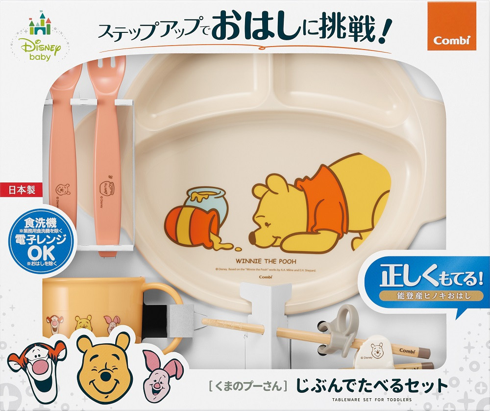 ①くまのプーさん充実セット:くまのプーさんデザインで楽しくお食事を♪ステップアップでおはしに挑戦!入園準備にもおススメの5点セット!