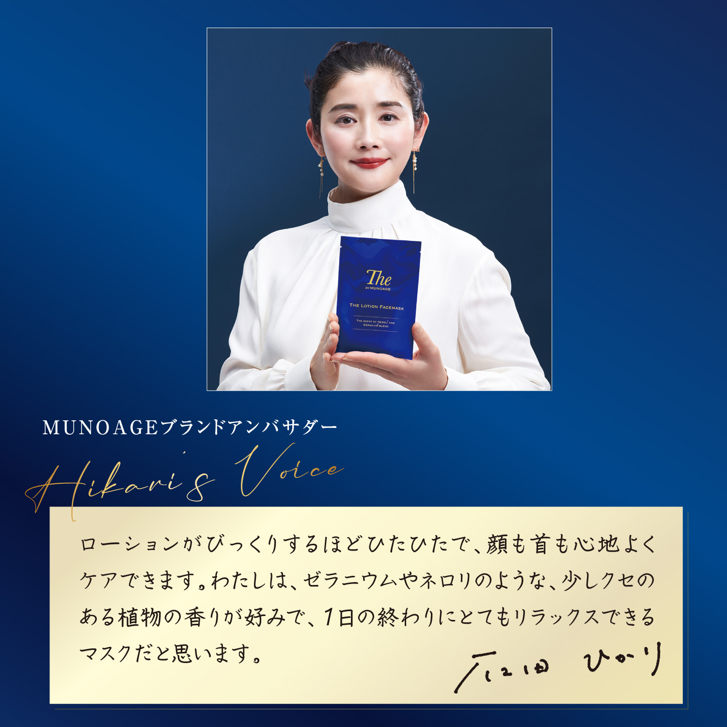 俳優石田ひかりさんとコラボレーションしたトリートメントフェイスマスク。ハリ弾力を与える7種のペプチド※1を3倍濃度※2で凝縮配合し、石田ひかりさんおすすめの8種の精油をブレンド。これ一枚で深く濃密なうるおい。肌をいたわりたいと感じた際におすすめです。