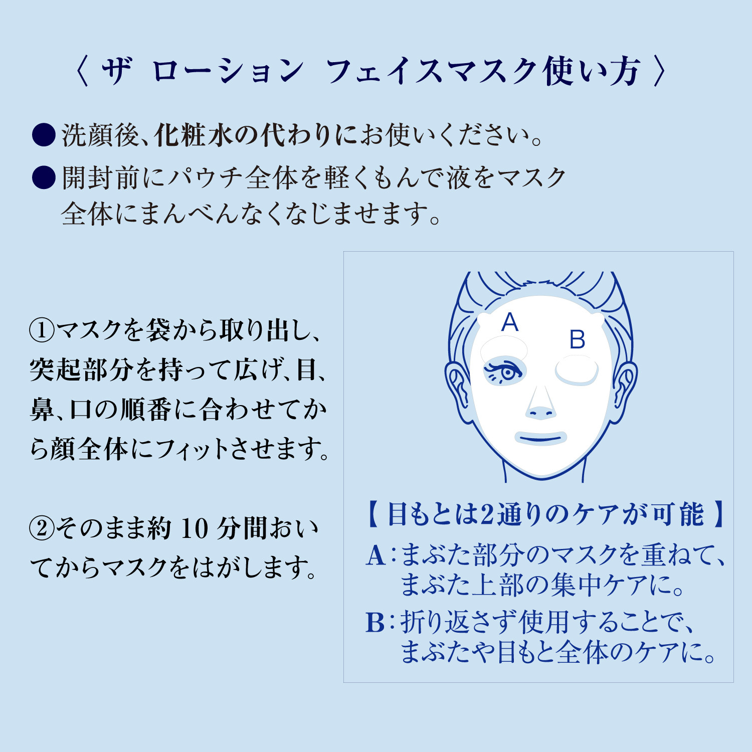 洗顔後、化粧水の代わりにお使いください。開封前にパウチ全体を軽くもんで液をマスク全体にまんべんなくなじませます。