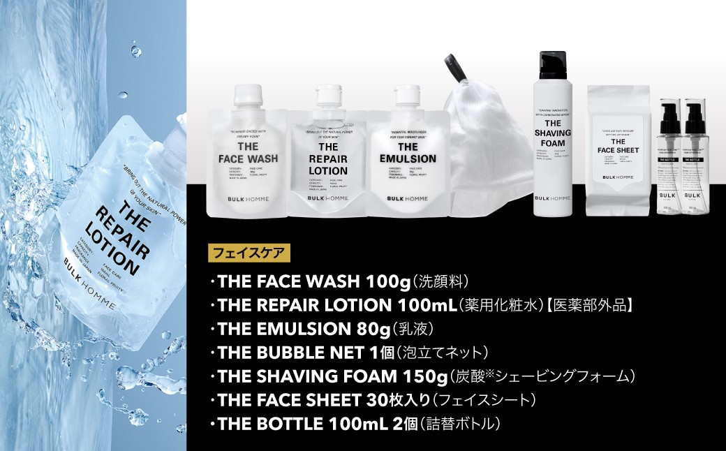 | 容量 | ●【セット内容】 【フェイスケア】 ・THE FACE WASH 100g(洗顔料) ・THE REPAIR LOTION 100mL(薬用化粧水)【医薬部外品】 ・THE EMULSION 80g(乳液) ・THE BUBBLE NET 1個(泡立てネット) ・THE SHAVING FOAM 150g(炭酸シェービングフォーム) ・THE FACE SHEET 30枚入り(フェイスシート) ・THE BOTTLE 100mL 2個(詰替ボトル) 【ボディケア】 ・THE BODY WASH 250g(薬用ボディウォッシュ)【医薬部外品】 ・THE BODY TREATMENT 150mL(薬用ボディトリートメント)【医薬部外品】 ・THE BODY TOWEL 1個(ボディタオル) 【ヘアケア】 ・THE SHAMPOO 200g(シャンプー) ・THE TREATMENT 180g(ヘアトリートメント) ・THE SCALP SERUM 50mL(頭皮用美容液) ・THE SCALP BRUSH 1個(スキャルプブラシ) ・THE HAIR OIL 70mL(ヘアオイル) 【OTHER】 ・THE FABRIC FRAGRANCE 300mL(衣類・布製品用芳香消臭剤) |