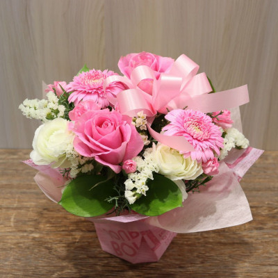 ピンクのバラ&ガーベラがメインの可愛らしいアレンジメント