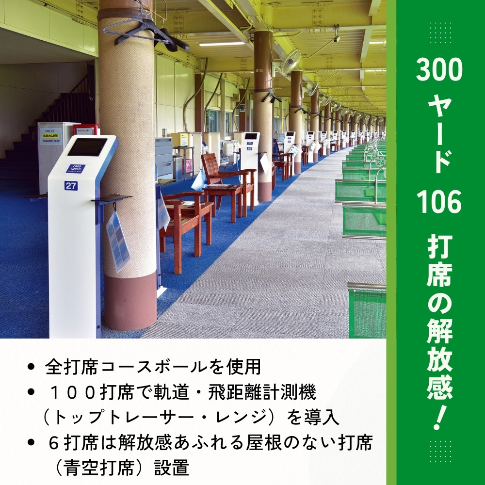 ゆとりを持った106打席ではコースボールを使用、その内100打席で軌道・飛距離計測機(トップトレーサー・レンジ)を導入し、クラブ別診断やバーチャルゴルフの体験が可能、他の6打席は開放感溢れる屋根の無い打席(青空打席)が設置されております。