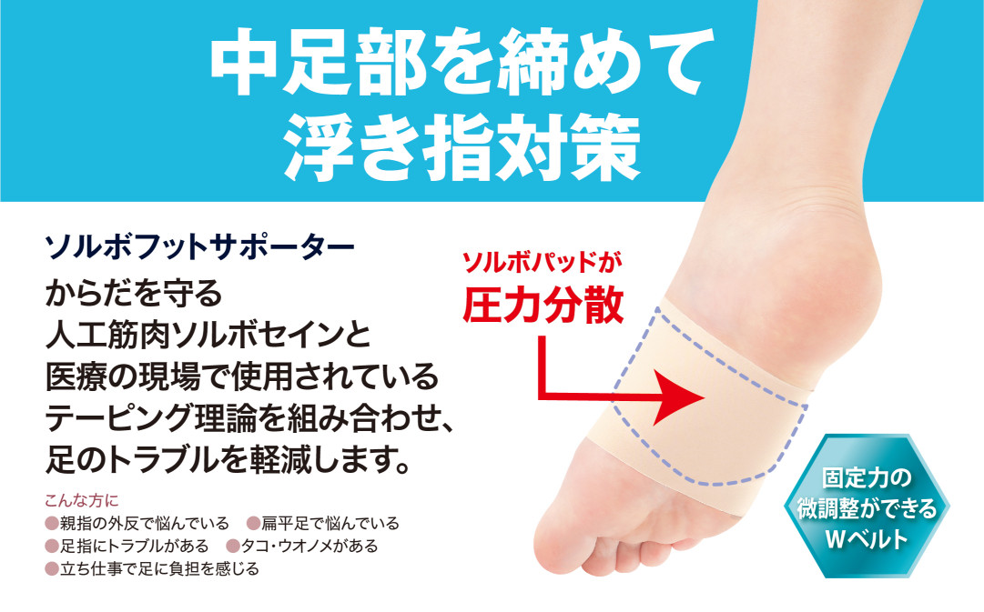 ソルボフットサポーターは特に足の中足部と足のアーチをサポートすることで、バランス良く足全体を使った正しい歩き方が自然に出来るようになります。