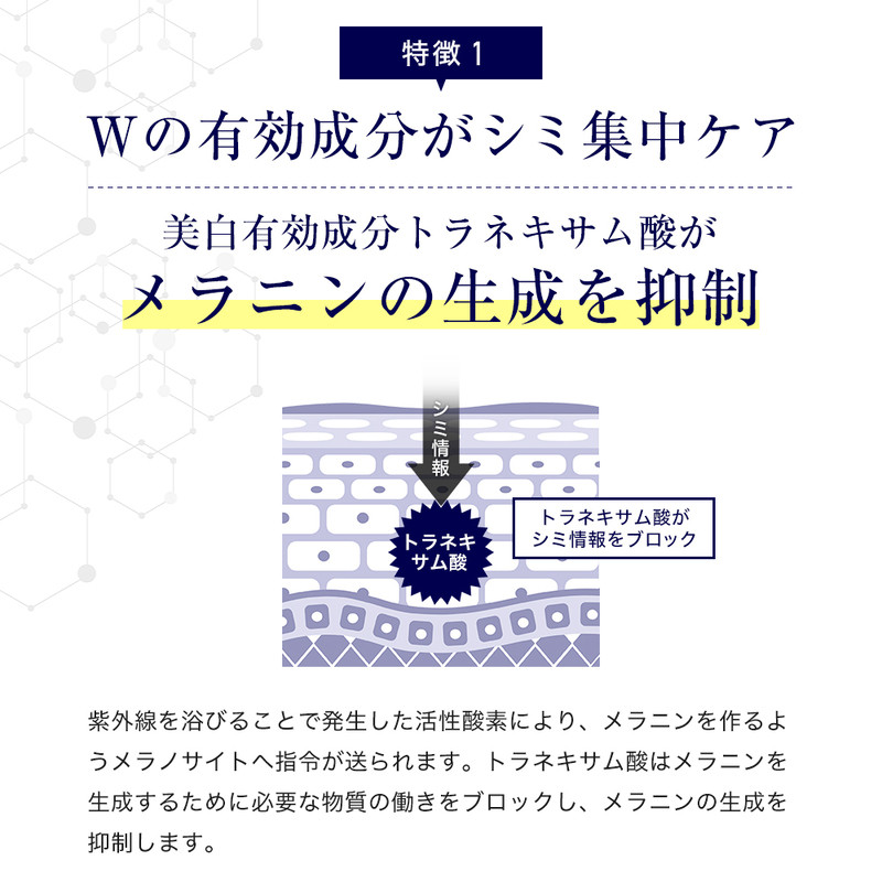 美白化粧水には欠かせない美白有効成分「トラネキサム酸」に加え、しみ情報のきっかけとなる炎症をブロックする肌荒れ防止成分「グリチルリチン酸2K」を有効成分として追加配合。