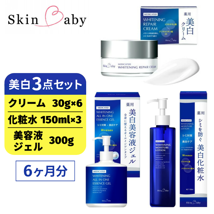 スキンケア 全身 首 肩 腕 ひじ かかと 肌 保湿 シミ シミ対策 スキンベビー 美白3点セット(約6ヶ月分)|美白クリーム 30g×6個+美白化粧水 150ml×3個+美白美容液ジェル 300g×1個 の3点セット|トラネキサム酸 温泉水 スクワラン【医薬部外品】 ※着日指定不可 FAA-048