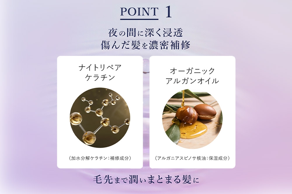 寝ている間に深く浸透しダメージ補修。毛先までうるおう髪へ。