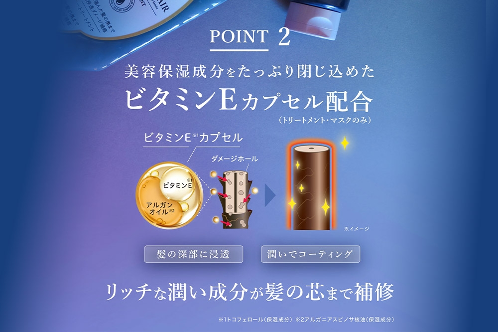 ※1 加水分解ケラチン(羊毛)(補修成分) ※2 アルガニアスピノサ核油(保湿成分)