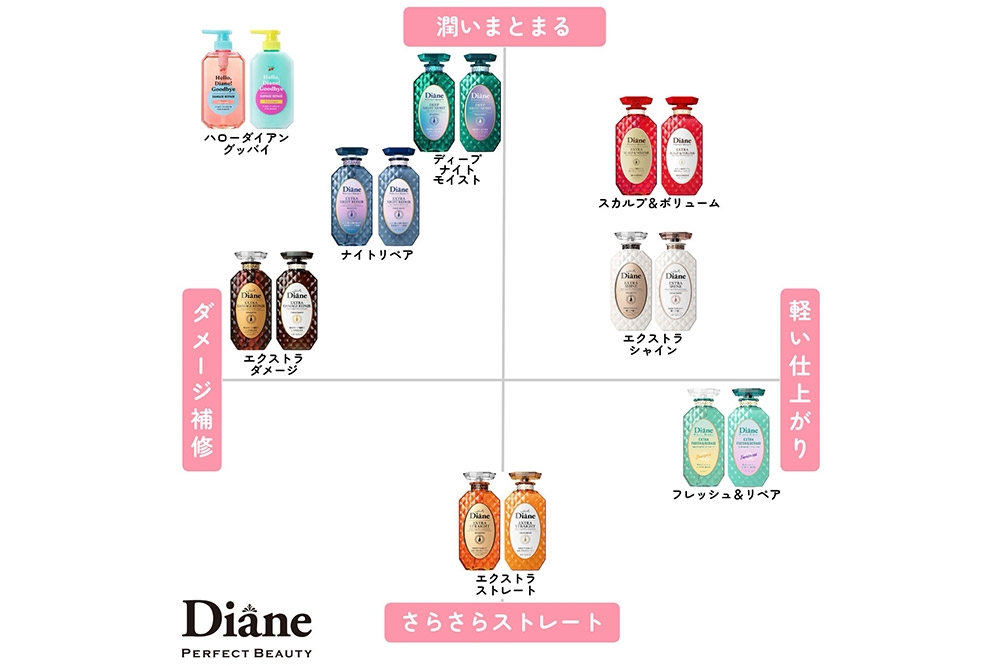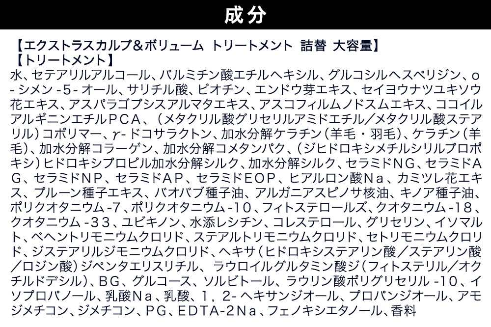 ※1 加水分解ケラチン(羊毛・羽毛)、ココイル加水分解ケラチンK(羊毛)(シャンプーのみ配合)、ケラチン(羊毛)(補修成分) ※2 アルガニアスピノサ核油 ※3 加水分解コラーゲン ※4 ヒアルロン酸Na ※5 アスパラゴプシスアルマタエキス、アスコフィルムノドスムエキス ※6 ユビキノン(※2~※6 保湿成分)