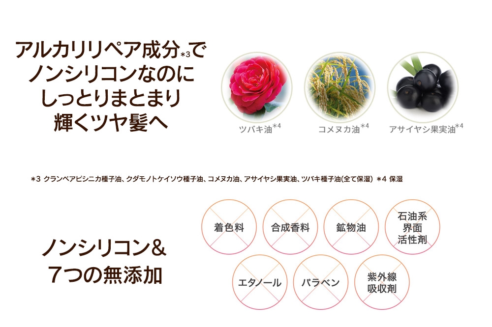 アルカリリペア成分*3を配合し、ノンシリコンなのにしっとりとまとまる髪へと導きます。