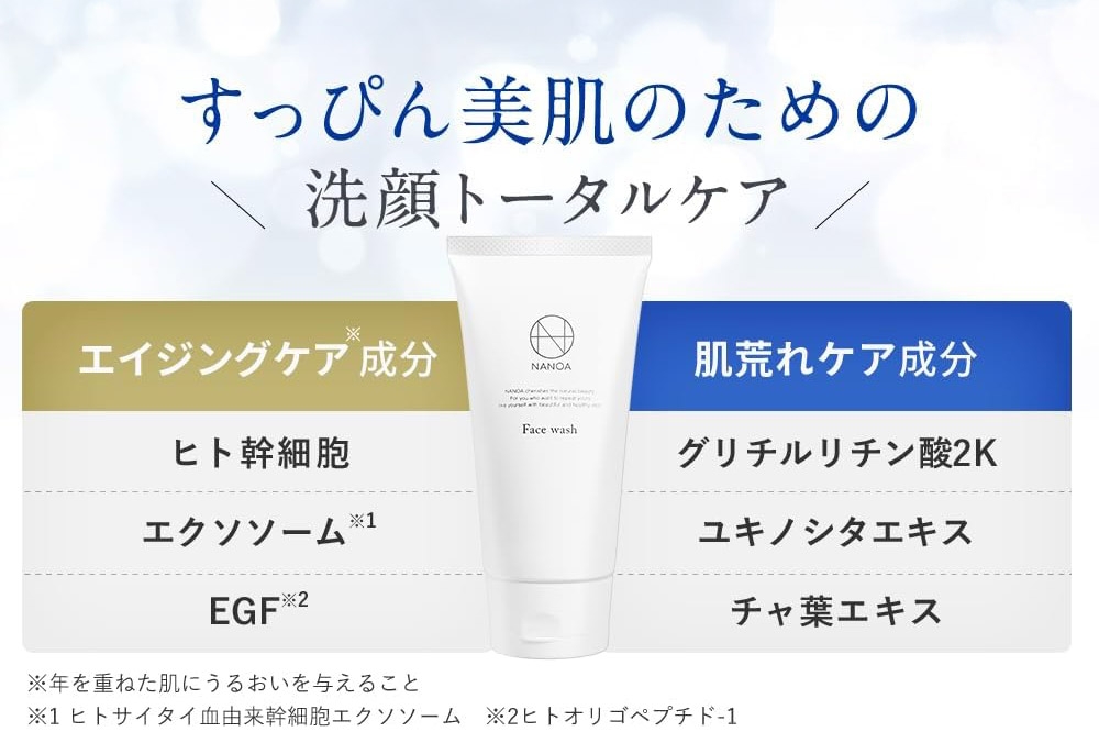 ・「もっちり濃密泡で、潤いたっぷり贅沢つや肌洗顔!」 ナノア洗顔フォームは、モコモコの超極小泡で汚れをしっかり落としつつ、つっぱらない保湿感でうるツヤ肌をキープできる洗顔フォームです。話題の整肌成分「ヒト幹細胞培養液」を贅沢に配合しています。