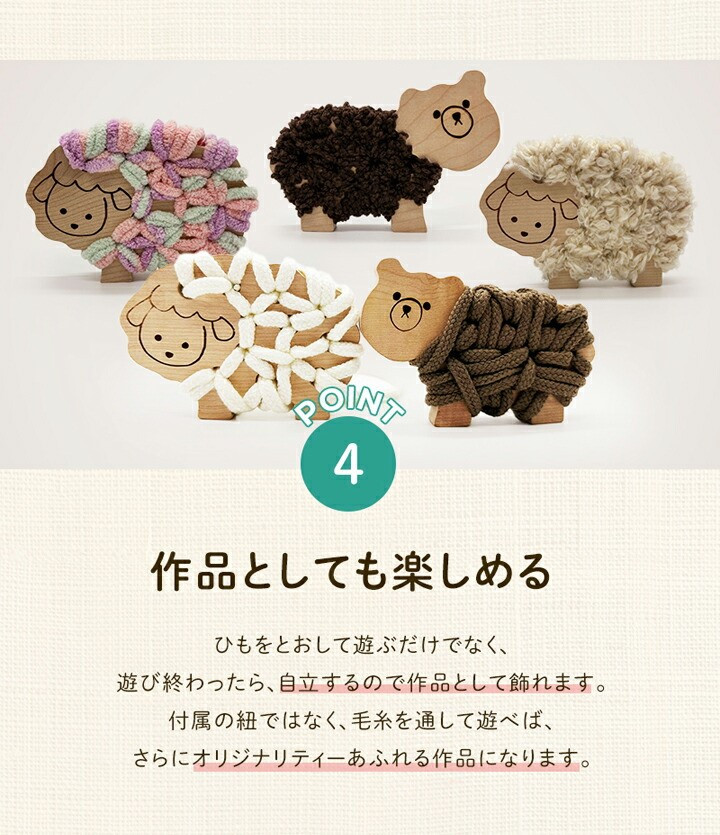 ひもをとおして遊ぶだけでなく、遊び終わったら、自立するので作品として飾れます。付属の紐だけでなく、毛糸を通して遊べばさらにオリジナリティーあふれる作品になります。
