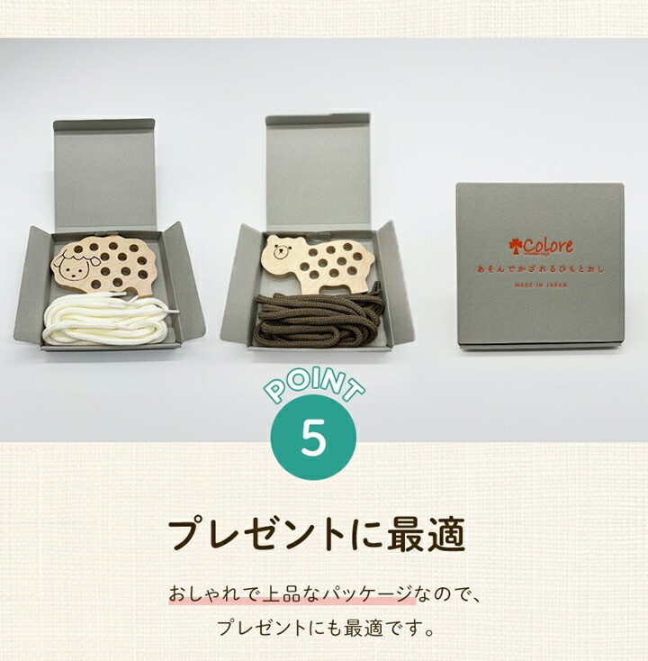動物に紐をとおすことにより、手先の器用さや集中力を発揮することができる最適な知育玩具です。遊んで飾れるひもとおしは想像力を刺激し、問題解決能力を育むのにも役立ちます。