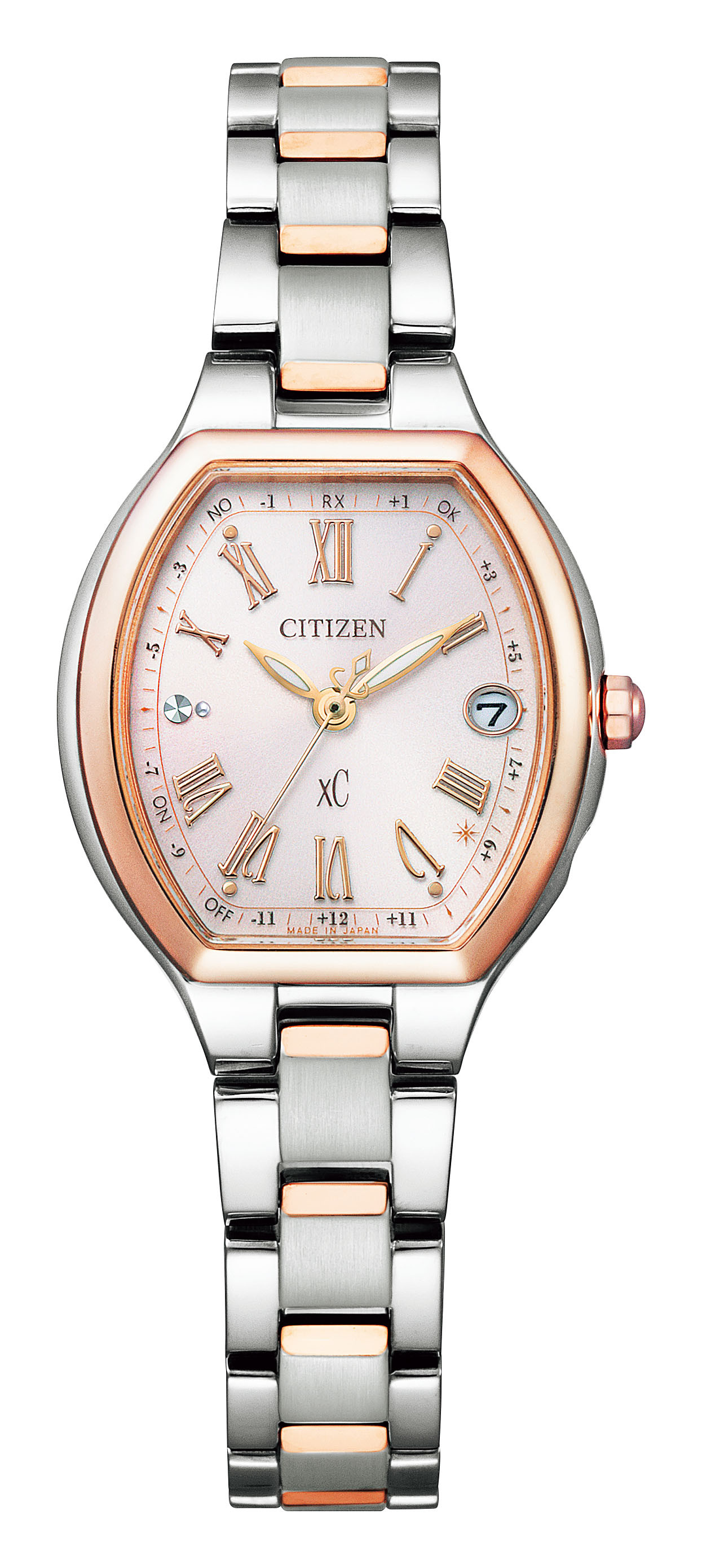 愛らしい印象の淡いピンクカラーに優美な印象のローマフォントがポイントのダイヤル。4時と5時の間にあるTYO位置には煌めく光のマークが女性心をくすぐります。ケース・バンドにはxCならではのピンクゴールドカラーをさりげなくあしらうツートン仕様で、上品な華やかさを演出してくれます。