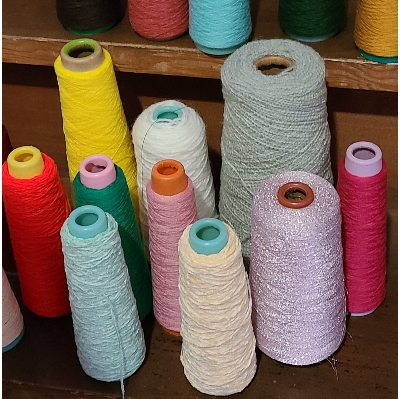 5色までお好きな糸をお選び頂き、よこ糸を作ります。よこ糸を巻いてはたおり機で織っていただきます。