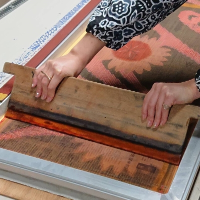 『秩父銘仙ほぐし捺染タペストリー体験』は、本格的な秩父銘仙の型を使い、絹100%のたて糸に自分で選んだ色で自分だけのオリジナルタペストリーを染色できる体験コースです。