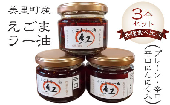 美里町産えごま100%のえごまと美里町産原材料を主に使って作った香り高いラー油 えごまラー油各種食べ比べ(プレーン・辛口・辛口にんにく入)3本セット【美里町特産えごま油使用】美里EGOMAファーム [No.011]