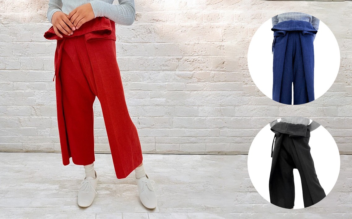ボトムスとしてだけでなく、トップスにもなってしまうTakane Sewing Studio のオリジナルタイパンツ。足の部分に両腕を通し、後ろから「ヨイショ!」と背負う感じにして完成。
