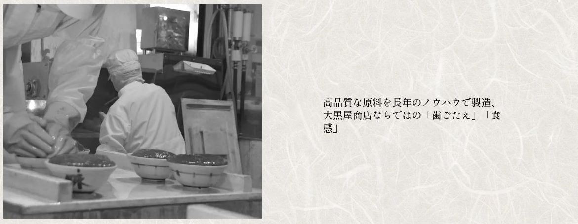 創業時より続く、「バタ練り製法」を使用したこんにゃくは、こんにゃくの中に空気を練り混んでいるため沢山の穴があり、その穴に煮汁が入るので味しみが大変よく、しっかりとした歯ごたえが特徴です。 つるっとした食感のさしみこんにゃくや、黒みつときな粉をかけて食べる「こんにゃくスイーツ」も、バタ練り製法ならでは。 是非ご賞味ください。 【提供事業者】株式会社 大黒屋商店 【TEL・FAX】048-581-0121・048-581-9373 【メールアドレス】info@daikokuya-shouten.co.jp 【URL】http://daikokuya-shouten.co.jp
