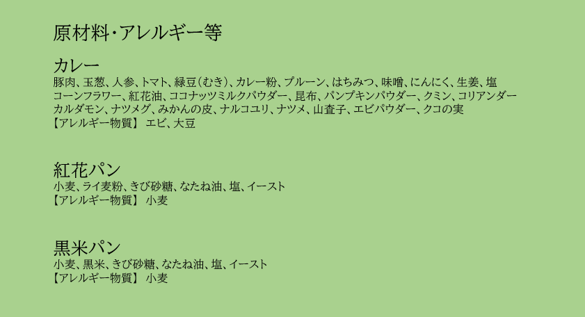 豚肉、玉ねぎ、人参、トマト、緑豆(むき)、カレー粉、プルーン、はちみつ、味噌、にんにく、生姜、塩、コーンフラワー、紅花油、ココナッツミルクパウダー、昆布、パンプキンパウダー、クミン、コリアンダー、カルダモン、ナツメグ、みかんの皮、ナルコユリ、ナツメ山査子、エビパウダー、クコの実