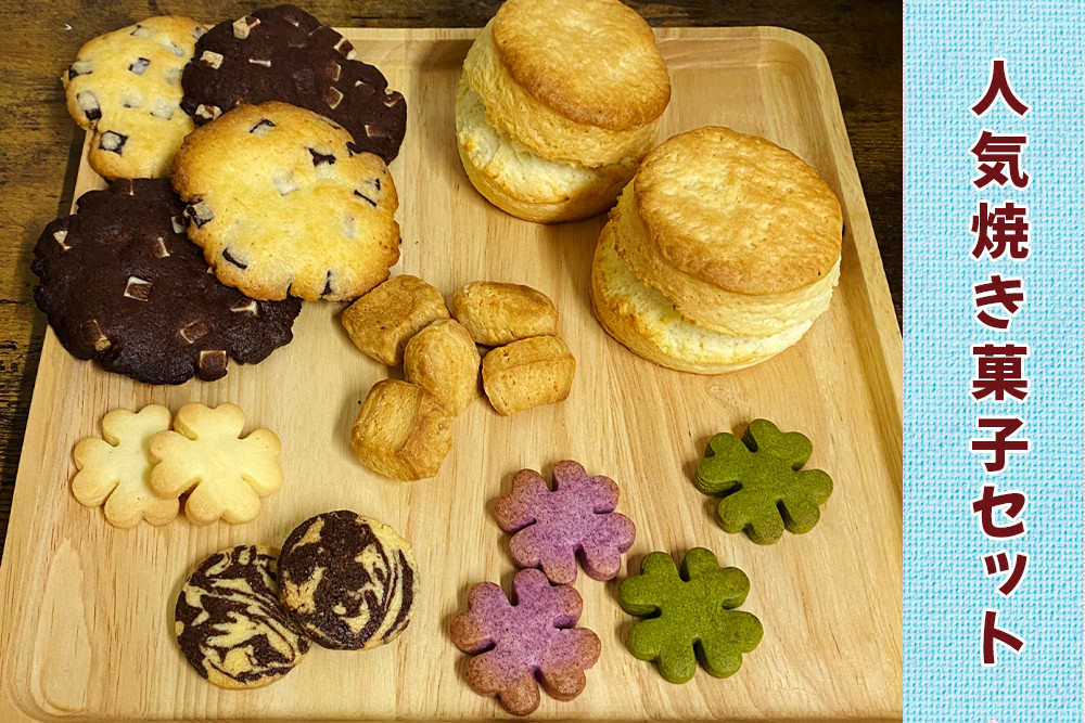 人気のチョコチャンククッキーをはじめ、ほうれん草と小松菜を使った「そこらへんの草クッキー」も入った当店で人気のお菓子の詰め合わせ。