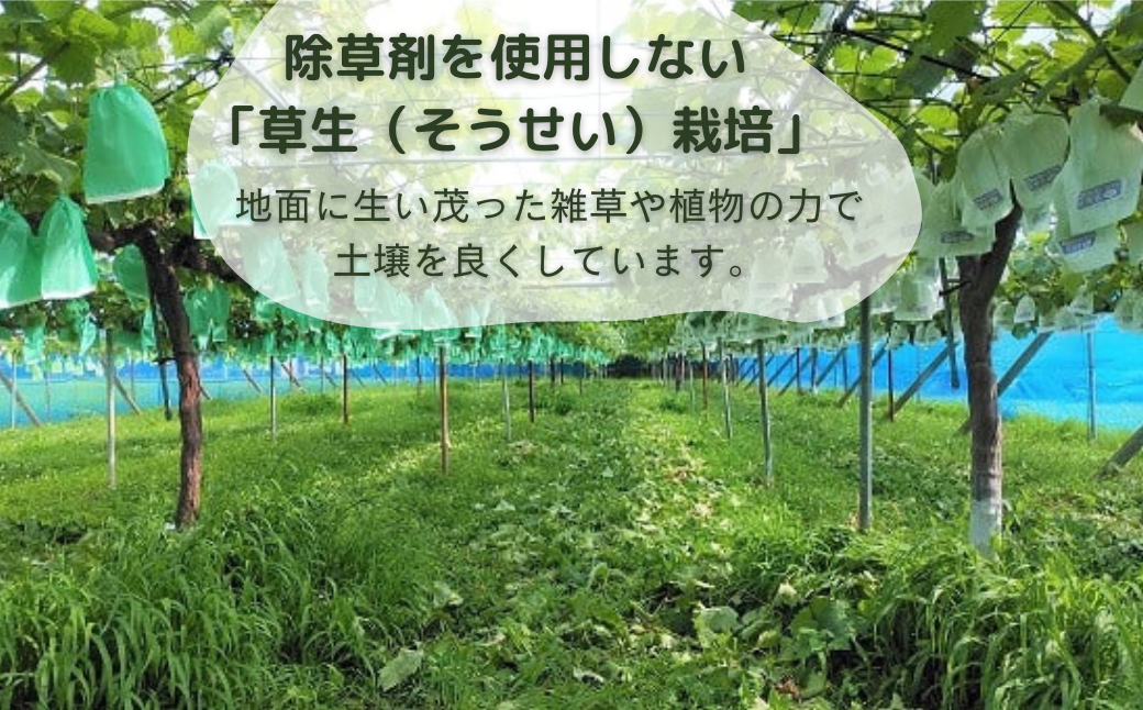 ぶどうは、無農薬で作ることは難しい果樹のため、当園では簡易雨除け施設を導入することで消毒回数を減らす、減農薬栽培を行っています。