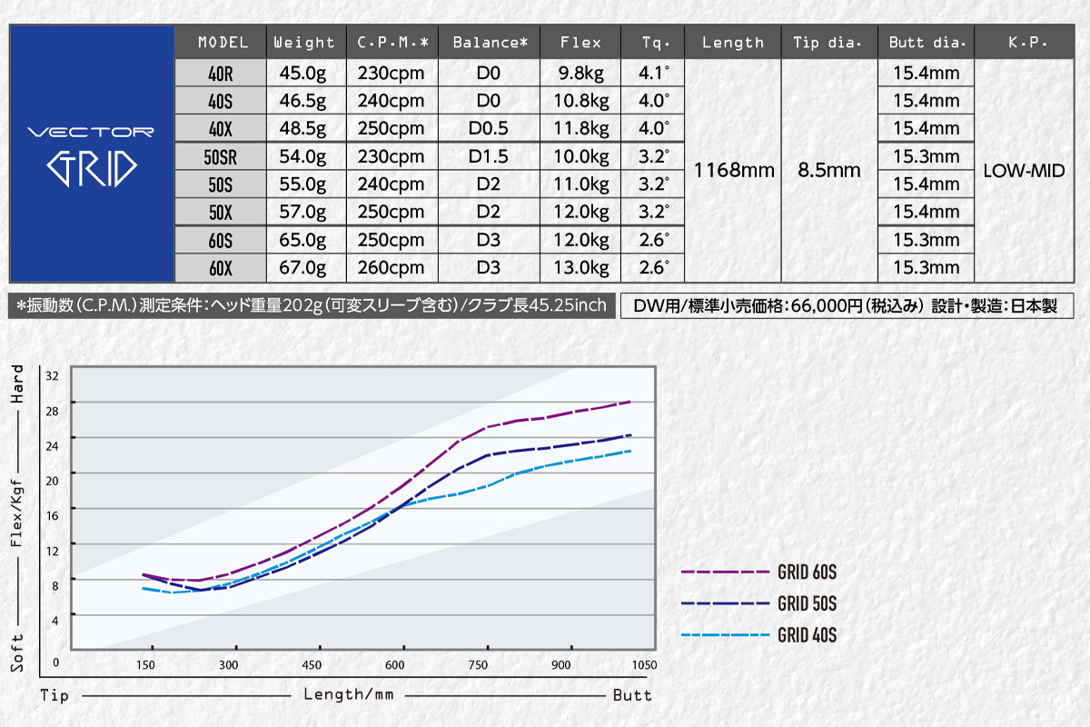 グリッド解析によりシャフトの剛性を詳細に測定し、余分な動きを排除し理想的なシャフト軌道を作り出すことに成功、さらなる飛距離性能を実現。