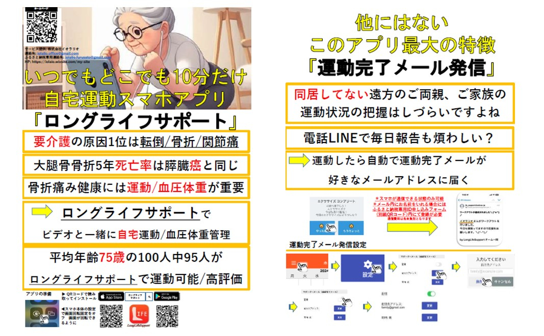千葉市オリジナル筋力動画である「ちばし いきいき体操」を参考に、整形外科医が転倒予防に必要な運動を加えてミックスさせた転倒予防ベーシック動画をDVDにしました。動画の名前が月曜日から日曜日となっている7種類の動画が入っており、運動をしたい日の曜日を選んでもらえば誰でも簡単にマネするだけで運動が可能です。運動中の転倒予防、さらには腰痛、膝痛をお持ちの方にも運動できるように配慮されております。また、利便性を高めるためにスマートフォンアプリ(iOS, Android)でも閲覧も可能です。スマートフォンでQRコードを読み取ってメールアドレス等を登録すると、閲覧用IDとパスワードをメールアドレスへ送付します。アプリも同様にQRコードよりダウンロードできます。
