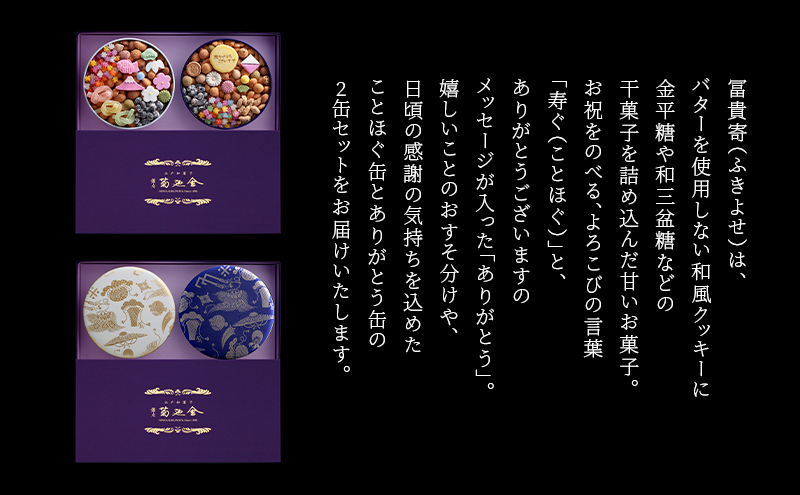 登録商標 冨貴寄(ふきよせ)は、バターを使用しない和風クッキーに金平糖や和三盆糖などの干菓子を詰め込んだ甘いお菓子。お祝をのべる、よろこびの言葉「寿ぐ(ことほぐ)」と、ありがとうございますのメッセージが入った「ありがとう」。嬉しいことのおすそ分けや、日頃の感謝の気持ちを込めたことほぐ缶とありがとう缶の2缶セットをお届けいたします。