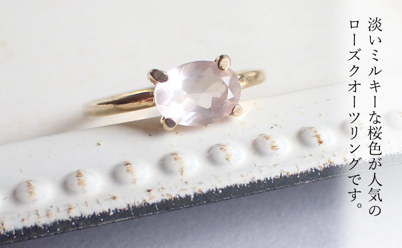 淡いミルキーな桜色が人気のローズクオーツリングです。上質な天然石を使用しており、表面には細かいカットが施され、繊細に輝いてくれます。肌馴染みが良い色なので、デイリー使いにとてもお勧めです。他の色石や、デザインリングとの重ねづけもお勧めです。