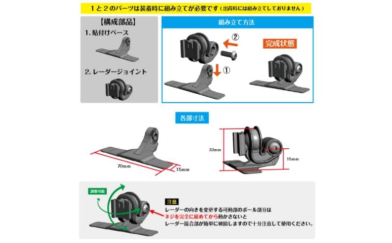 ※レーダーの向きを変更する可動部分のボール部分はネジを完全に緩めてから動かさないと、接合部が簡単に折れてしまいます。接合部箇所だけの破損は保証ない為、操作には十分注意して使用ください。