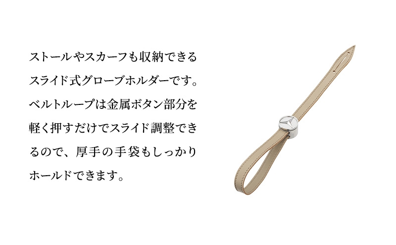 ストールやスカーフも収納できるスライド式グローブホルダーです。ベルトループは金属ボタン部分を軽く押すだけでスライド調整できるので、厚手の手袋もしっかりホールドできます。