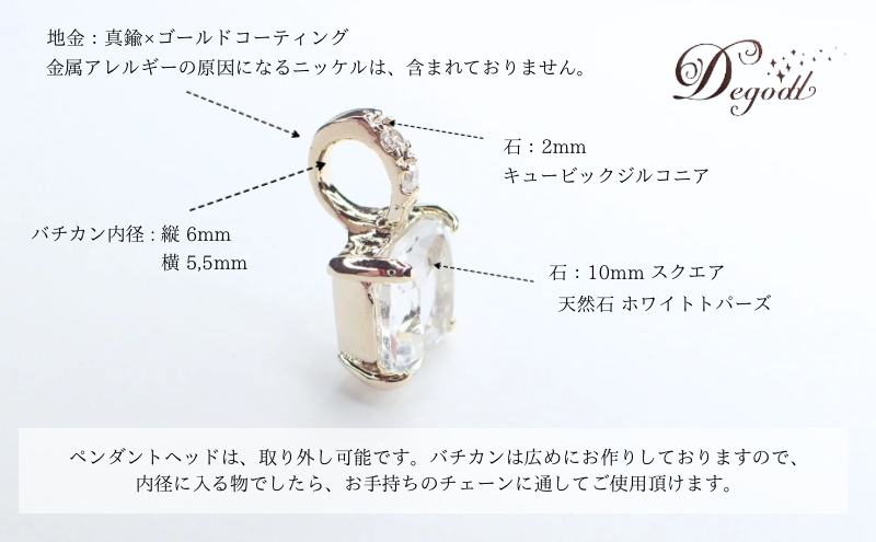| 容量 | 天然石ホワイトトパーズネックレス 1点 内容量:約3g 素材:天然石ホワイトトパーズ10mm×10mm、キュービックジルコニア2mm、真鍮×ゴールドコーティング(ニッケルフリー)、チェーン:真鍮×ゴールドコーティング約50cm、原産地:日本/千葉県 |