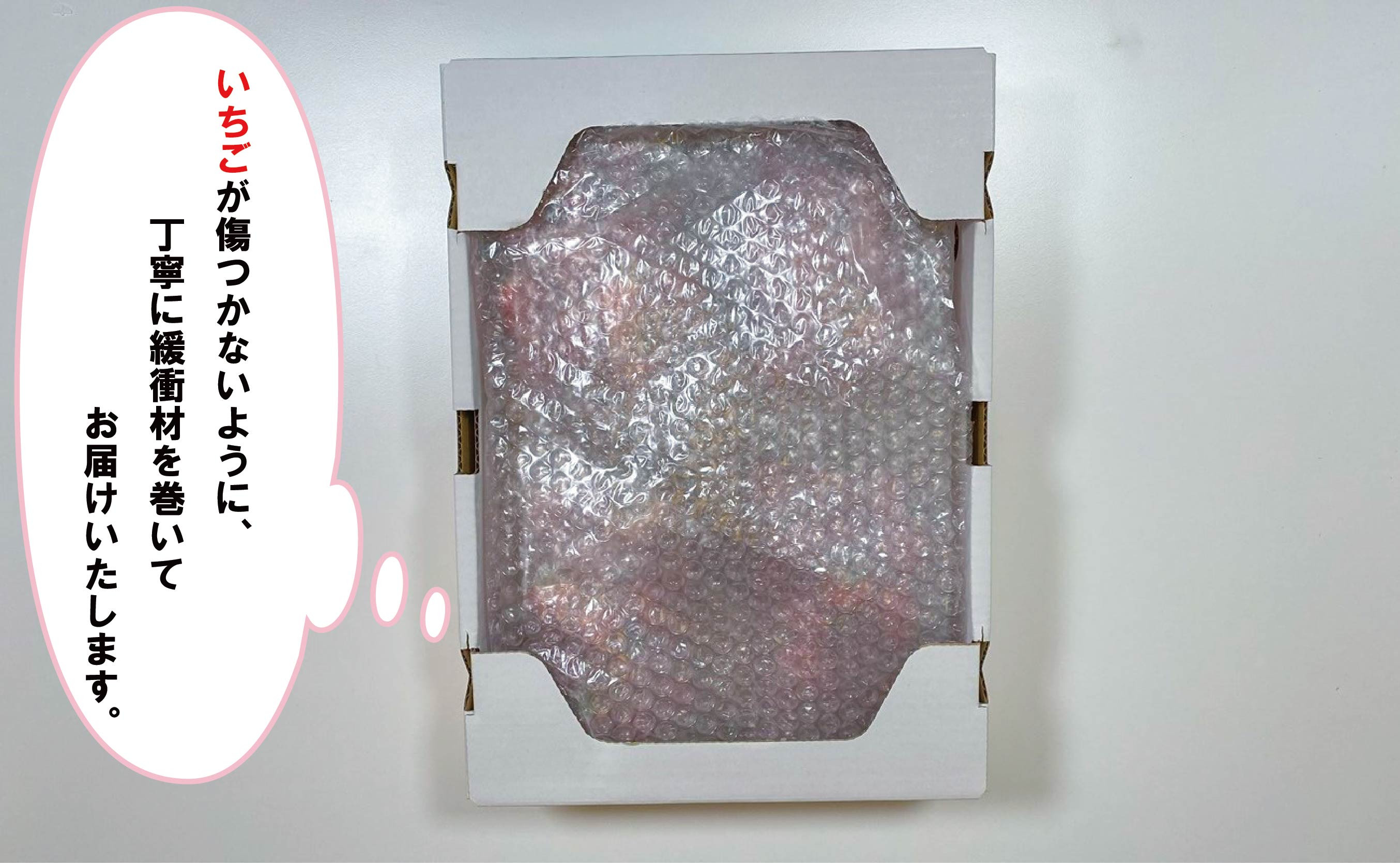 ・いちごは、大変デリケートなお品物です。細心の注意をはらって大切に発送いたしますが、輸送中に傷みが生じるなど、何らかのトラブルにより品質に不備が出る場合がございます。