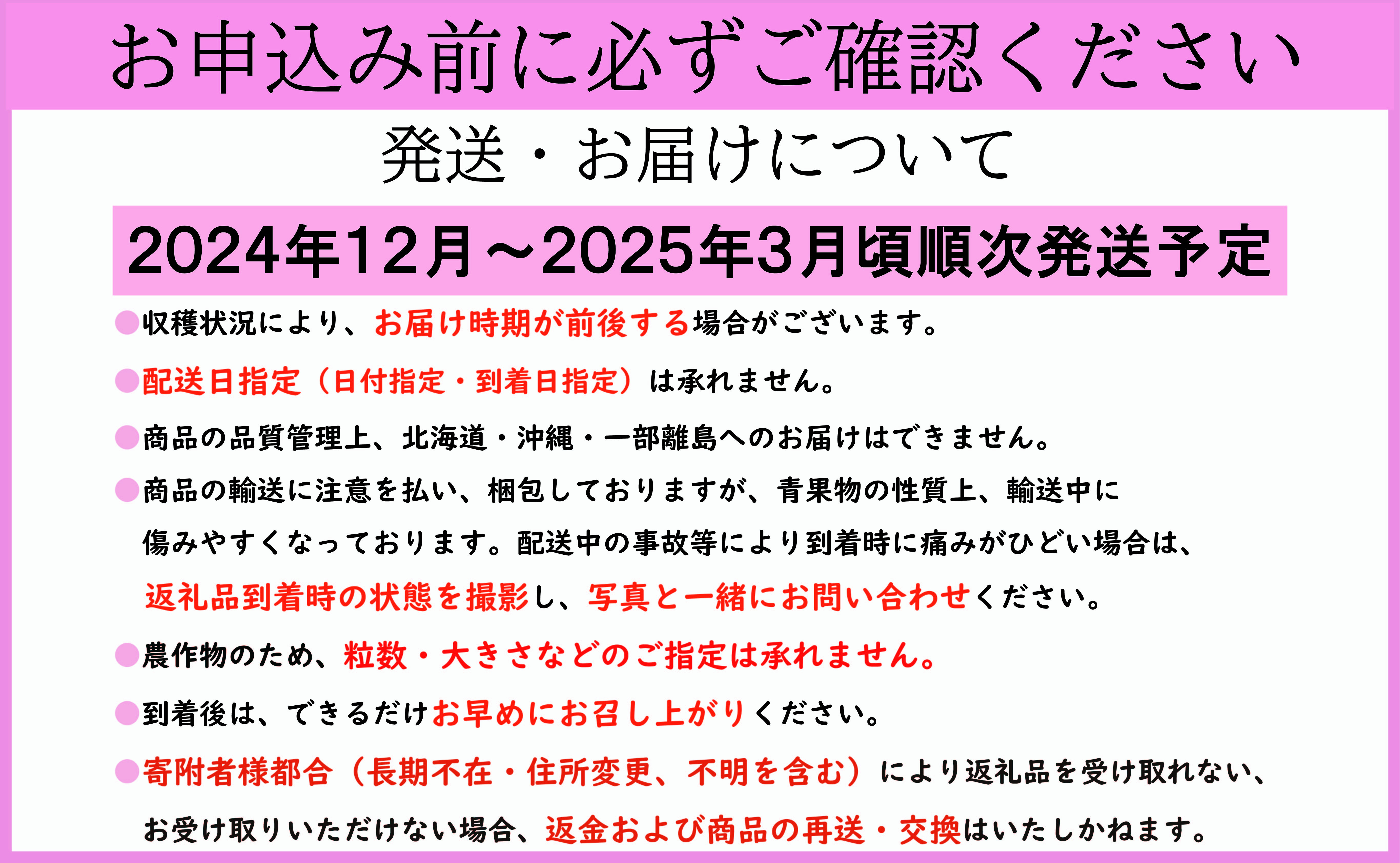 ・発送は12月~3月まで、準備が整い次第発送させていただきます。